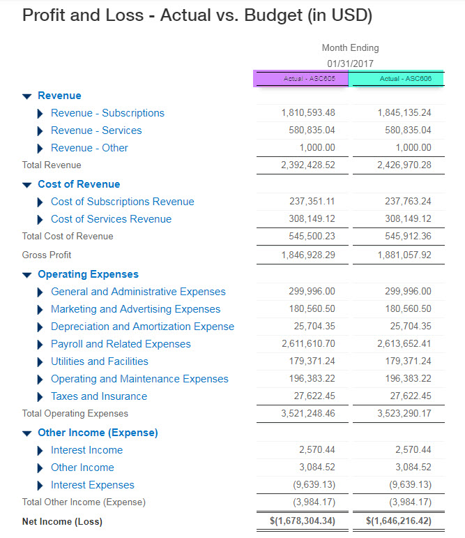 Below, is an example of a Profit and Loss report with a side-by-side comparison of ASC 605 and ASC 606.