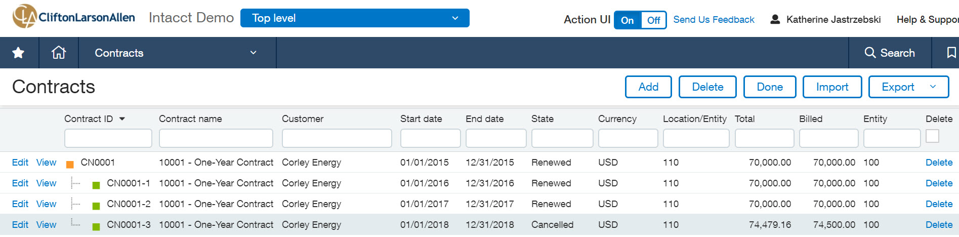 First off, contracts is a dimension in Intacct. You know from the way you run your business you really do have a single contract with a customer which they may add on to, renew over time, or amend. Seeing the whole picture clearly from a financial reporting standpoint is vital. You might wonder: How profitable is each contract? Is there an opportunity for up-selling? Are they dropping products? Renewing? Having Contracts as a dimension makes answering these types of questions possible.